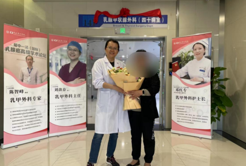 乳腺甲状腺外科,找到当年为她实施手术的刘歆春主任和其他医护人员,向大家当面表示感谢,刘歆春主任代表大家将一束鲜花送给了向洁,大家在喜悦的心情中合影留恋。