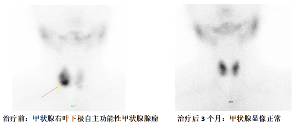甲状腺疾病碘-131治疗门诊看病,经过检查后,李赛春主任告知患者甲状腺结节是良性的自主功能性甲状腺腺瘤,甲亢也是源于这个腺瘤,通过碘-131治疗就可以解决这些困扰,经充分评估和完善相关检查后,予以碘-131治疗,1个月门诊复查,陈女士自诉吃饭也正常了,不再饿得慌,怕热、多汗、心慌这些症状全没有了,3个月门诊复查甲状腺功能及甲状腺显像恢复正常,目前陈女士已完全康复。