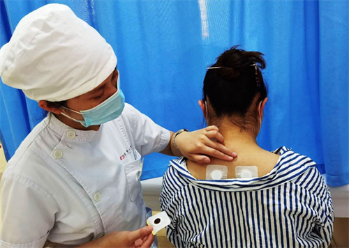 应用中草药敷贴贴于特定穴位上,通过穴位对药物的吸收及激发经气的作用调和气血,改善血液循环,促进和调整机体的免疫机能,达到治疗的目的。