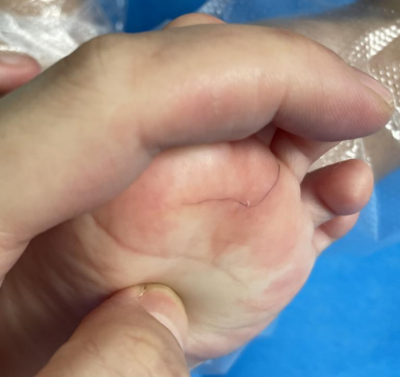 皮肤科副主任医师张超接诊后,脱下幼儿的鞋袜,仔细查看幼儿的左脚,肉眼可见孩子的左足前脚掌部位皮肤下“钻”进了一根长约4CM的黑色头发丝,发丝完全“嵌入”到皮下,能够清晰看到。头发丝的前端还一直延伸至二趾、三趾间的皮肤里,导致趾缝间隙发红,有感染迹象。轻轻触压发丝“嵌”入皮肤位置,幼儿立即大声哭闹,不适感明显。