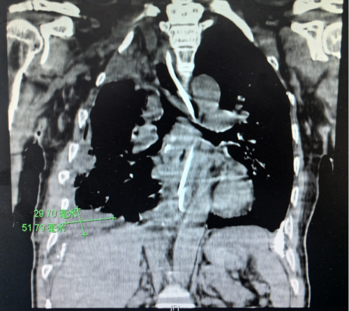 胸外科、心脏大血管外科,科室主任、主任医师袁跃西查看了张根水的胸部CT,清晰可见他的右侧胸腔存在一个巨大的慢性包裹性脓胸,因为病程长,病灶迁延不愈,包裹的纤维板已经钙化为一层厚厚的硬壳,脓腔里还有18×10cm机化的坏死组织,宛如一个“硬壳鸵鸟蛋”塞进了他的胸腔。