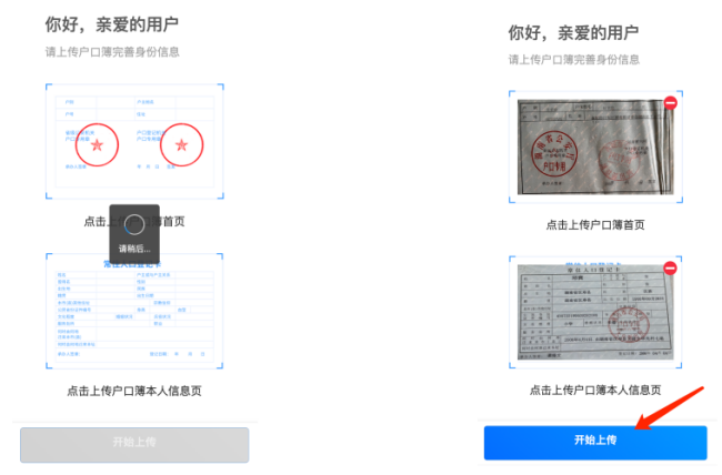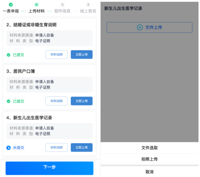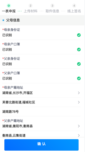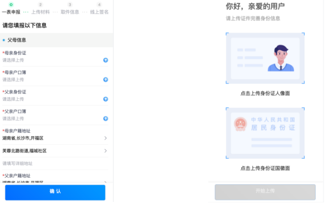 5、填报表单:请分别上传(从文件选取或拍照上传)母亲、父亲的身份证正反面和户口薄的立博体育、本人页,并确认图片识别结果无误。其中,要特别注意核对身份证地址,确认识别结果和证件照面信息一致。继续填写完善新生儿姓名、落户地址、父母亲联系方式、家庭住址、参保地址等信息。点击“下一步”,进入“材料提交”页面。