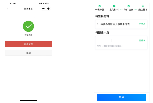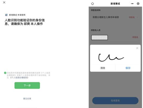 8、在线签名:根据填报内容,系统生成我要办理新生儿事项申请表。点击“立即签名”,跳转微信小程序,签名人员进行人脸识别认证。认证通过后,在手写区域绘制、保存签名。签名状态变更为“已签名”后,点击“提交办件”,完成申报申请。