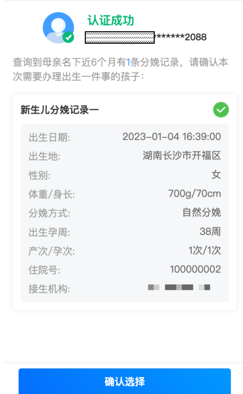 4、确认分娩信息:确认系统查询到的分娩信息无误,点击“确认”;如分娩信息有误,请前往接生机构反馈给医护人员,更新分娩信息。