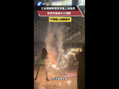 1月1日,河南郑州,三人在窨井盖上燃放烟花时,烟花燃放产生的火星不慎掉入窨井内,井盖被瞬间顶翻并窜出数米高火焰。