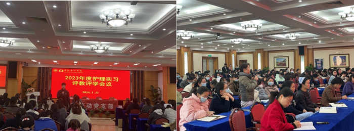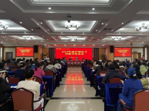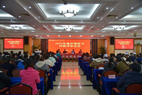 护理部举行2023年度护理实习评教评学大会。流动党支部书记、部分党员代表,全院各科护士长、总带教老师,各学校实习同学们参加了会议。