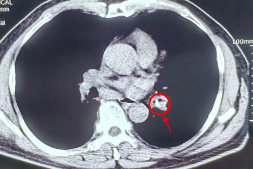 刘大爷回忆,大概是去年的3月,他在吃饭时边跟家人聊天,喝骨头汤时不小心发生了呛咳,当时感觉有东西卡在喉咙,反复使劲咳嗽后,不适的感觉有缓解,他也没太放在心上。没想到的是,一年时间过去了,吸入的猪骨头竟在他的气管内“安家落户”了。