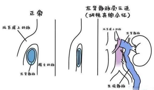 文锐介绍,胡桃夹综合征又称左肾静脉压迫综合征,是左肾静脉在腹主动脉和肠系膜上动脉所形成的夹角处受机械挤压后致左肾静脉回流受阻,从而引起左肾、输尿管及生殖腺静脉内压增高产生的一系列临床症候群的现象。最初,左肾静脉从腹主动脉和肠系膜上动脉这两根血管之间通过称为“胡桃夹现象”,不会有明显的症状。因此,很多患者不能发现问题,或是像王玉玲一样通过常规体检才得到警示。当“胡桃夹现象”引发血尿、蛋白尿、左腰腹痛等一系列临床症状时,才被称为胡桃夹综合征。胡桃夹综合征可以出现在幼儿到七十岁的任何时间段,在中青年人中发病率比较高一些,并且“偏爱”体型高瘦者。
