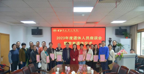 座谈会在和谐温馨的气氛中圆满结束,邓平、蔡岳祥为退休职工颁发退休纪念品和物资慰问券并合影留念。