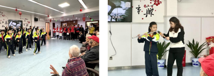 活动的第一个环节是来自黎塘小学4(1)班和4(3)班少先队员们的表演和慰问。手势舞《学习雷锋好榜样》《天天向上》、长笛独奏《千与千寻》《孤勇者》、演讲《所见皆是美好》等精彩节目赢得了现场老人们的阵阵掌声,之后同学们送上了精心准备的牛奶、八宝粥和沙琪玛等慰问品,表达对老人们的关心和爱护。