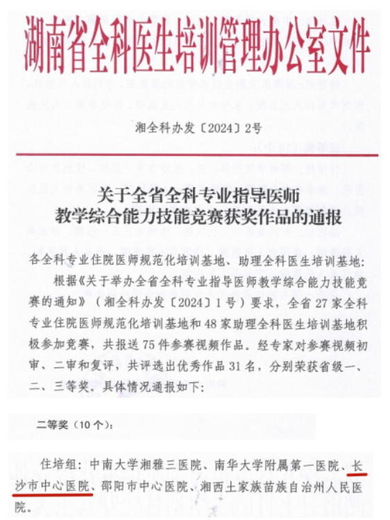 高度重视全科专业住院医师规范化培训工作,注重规范化培训的过程管理。自2018年全科医学科独立后,全科基地加强全科师资建设,本着科学严谨、精益求精的带教精神,坚持以赛促教、以赛促学、以赛促改、以赛促培的带教理念,积极参加各类竞赛活动,提升全科专业指导医师带教能力和水平,2022年、2023年均获得省级三等奖,今年荣获省级二等奖。全科基地将继续以竞赛为契机,以提高全科临床思维能力培养为目标,通过规范化的全科理念教学,有效提高全科住院医师的综合能力,培养更多高质量的全科医学人才。