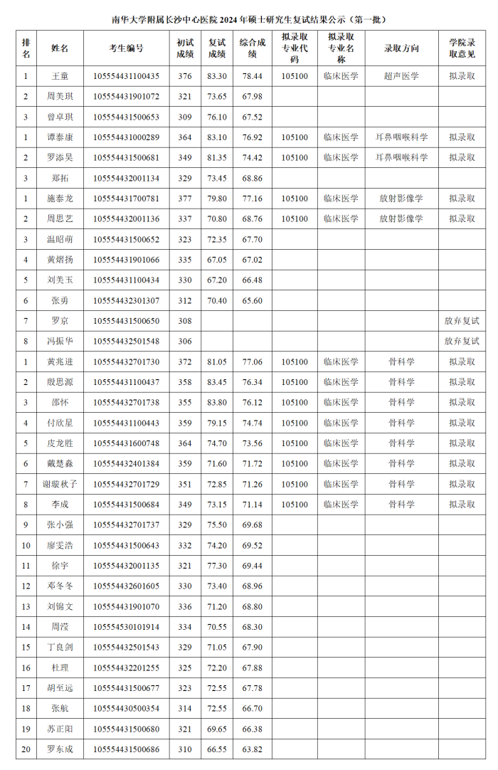 根据《南华大学2024年硕士研究生招生复试录取工作方案》、《南华大学附属长沙中心立博体育 2024年硕士研究生复试录取工作方案》,经南华大学附属长沙中心立博体育 研究生招生工作领导小组审核,现将2024年硕士研究生一志愿拟录取名单予以公示,公示期为2024年4月2日-12日,如对复试结果有异议,请联系内部监督审计部,联系电话:0731-85668104。