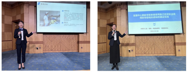 责任护士肖敏首先进行了详细的病例汇报,对于如何预防患者中心静脉导管相关感染提出临床问题。肾病、风湿免疫科盘婧婧护士长将临床问题结构化、具体化,构建循证问题:留置中心静脉导管患者使用氯己定皮肤消毒是否较络合碘消毒更能有效预防导管相关感染?盘婧婧从项目背景、证据应用目的和意义、循证问题构建、证据检索、应用证据的具体情况、证据的临床适用性初步分析、项目团队的组建、证据应用场景分析、对证据实践改变的准备度、应用证据对应的审查指标及方法、基线审查方案及结果、证据应用的促进因素和障碍因素分析、变革策略的构建、证据应用开展的实际情况、证据应用后的审查指标的再次评价等多个方面详细汇报了如何通过循证实践来降低中心静脉导管相关感染的发生。