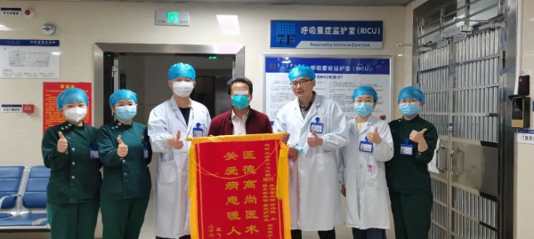 呼吸重症监护室门口,为感谢医护团队将命悬一线的女儿成功救治,重症狼疮肺炎患者王舒雅(化名)的父亲王先生将一面感谢锦旗送到了呼吸与危重症医学科重症监护室的医护人员手中。