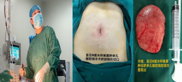 今年28岁的小美(化名)单位体检发现右侧有一个9cm卵巢囊肿,医生建议手术治疗。想到自己还没结婚生子,手术后肚子上会留疤,这让小美担忧不已。接诊医生妇产科三区主任魏馨看出了小美的顾虑,经过充分的检查和评估后,决定为其进行经脐单孔腹腔镜手术。