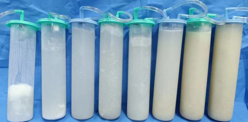 “目前主要治疗方案为全肺灌洗和粒细胞-巨噬细胞集落刺激因子治疗。其中大容量肺泡灌洗术是一种确切有效的治疗手段,而此类手术需要强大的麻醉支持,具有一定的风险,需要医疗团队密切协作才能完成。”科主任杨红忠、副主任刘胜岗和副主任医师刘超群等组成的专家团队充分讨论后,决定为他进行大容量肺泡灌洗术,在全麻支持下双腔气管插管单肺通气下,前后进行了左肺及右肺两次大容量肺泡灌洗。每次历时5小时,每侧灌洗恒温生理盐水15000ml,回收14800ml,回收率达98.7%。手术很顺利,常先生被转回普通病房,科室对他的灌洗液再次进行病理送检,证实为肺泡蛋白沉积症。术后,他呼吸困难症状明显改善,活动耐量大幅提升。