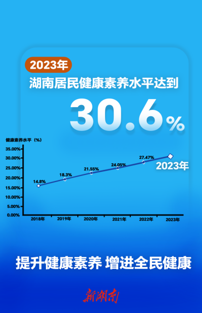 记者从湖南省卫生健康委员会获悉,2023年湖南省居民健康素养水平达到30.60%,比全国居民健康素养水平高0.9个百分点,较我省2022年上升了3.13个百分点,继续呈现逐年稳步提升趋势。