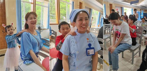 游戏结束后,康复医学科主治医师陈智志现场授课,教授职工子弟学习康复治疗中的按摩推拿基础手法,包括掌推法、指拿法、叩击法等,并示范这些手法在颈肩腰治疗中的应用。孩子们聚精会神地学习,并主动跟随陈智志的示范动作一遍遍地练习。看着孩子们认真的模样,护士妈妈们倍感欣慰。
