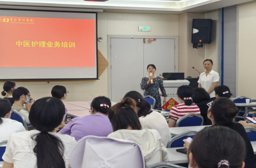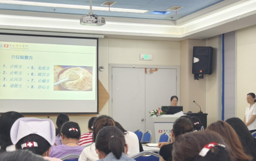 中西医结合科张凌护士长进行“中医腧穴及中药贴敷相关知识”的理论授课,她从经络、腧穴分类和作用到腧穴定位及中药贴敷等方面均进行了详细讲解,让学员了解穴位贴敷技术在临床应用中的主要功效,带领学员学好中医、用好中医。