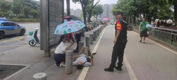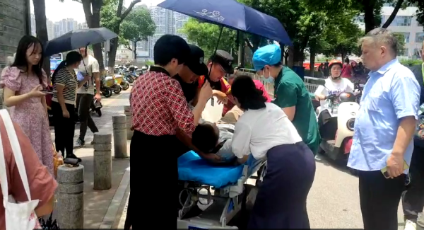 工作人员谈慧经过事发路段,担心老人中暑,便蹲下来为老人撑伞降温,同时安慰他不要着急,等急诊科医护人员赶到后,众人帮忙一起将老人抬到担架车上,火速送往急诊科救治。