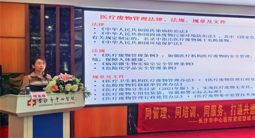 感染管理部何亚琼主讲《医疗废物管理知识培训》。她讲解了医疗废物定义、管理法规及操作规范,明确了医疗机构在医疗废物管理方面的制度和要求,提高了参训人员的管理水平和安全意识。