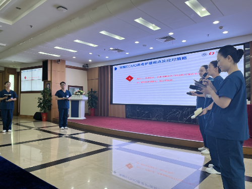 重症医学科护理团队以一例爆发性心肌炎清醒ECMO患者为查房对象,重点讨论此疑难病例的护理相关问题及总结反思。责任护士宋艺首先进行了详细的病例汇报,由二级护士田兰进行床旁查体,同时护士彭奥喆对心肌炎及及爆发性心肌炎的相关知识进行详细讲解。查房护理团队针对责任护士提出的疑难护理问题进行讨论,重症护理康复治疗师二级护士田兰对ECMO导管的安全措施进行解答,并详细讲解了清醒ECMO患者康复介入时机,播放了该患者ECMO治疗下康复活动视频,指出今后ECMO患者康复护理的发展方向。重症护理ECMO专家二级护士刘秀艳对ECMO运行过程中存在的难点及重点问题“抗凝管理、监测及南北综合症”的发病机制、临床表现及监测进行详细解答,查房主持人张雯副护士长对各级护士的工作进行了点评及指导,也提出了成人爆发性心肌炎的最新理念及治疗新方案。
