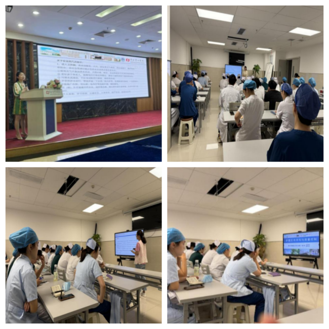 感染管理部主任杨东华主讲了院内感染防控以及职业防护,心理咨询专家王特副主任详细讲解了患者常见心理问题及护理措施,并以正念方式指导学员保持良好的心态。人文护理小组组长周晴从穿着体态、场所礼仪、专业态度等方面主讲了“护理职业礼仪”。蒋丽方、赵红两位护士长分别主讲了深静脉血栓、住院患者跌倒的风险评估与预防。