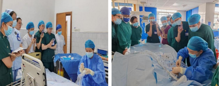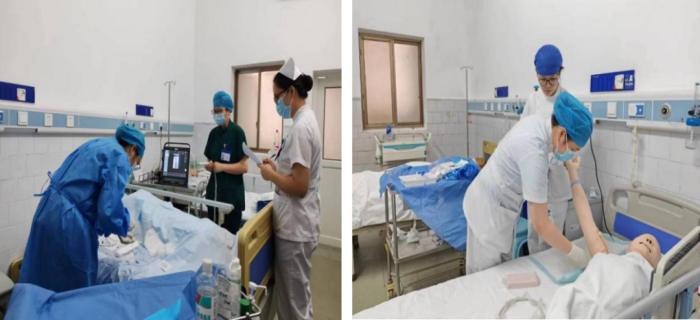 第二天为模拟实操培训,静脉治疗护理小组骨干钟艳、陈亚兰现场展示了血管超声仪下中长导管的置入技术,从如何使用超声仪识别动静脉,到血管选择、导管型号选择、穿刺角度、置管长度等,每一个步骤都进行了详细的讲解与示范,确保学员们能够直观地学习并掌握重点。
