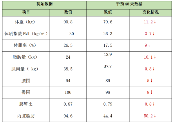 王明(化名),男,18岁,身高174cm,初始体重90.8kg,BMI30,腰围94cm,臀围106cm。减重的目的是避免因体重超标而影响大学录取的风险。通过48天的饮食+运动干预,体重减轻11.2kg。王明表示,医生定制的减重方案比较容易执行,没有挨饿的不适感,也没有馋嘴的迫切感,整个过程减掉的主要是脂肪,肌肉维持在基数范围内,顺利达成减重目标。