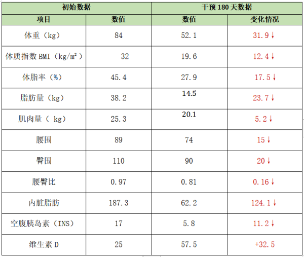 营养门诊就诊,人体成分分析显示体脂率和内脏脂肪面积均高于正常值,诊断单纯性肥胖、胰岛素抵抗、维生素D缺乏。根据医生定制的180天减重方案,嘉怡成功减重31.9kg,体脂率、内脏脂肪面积、空腹胰岛素水平均恢复正常,整个人焕然一新。