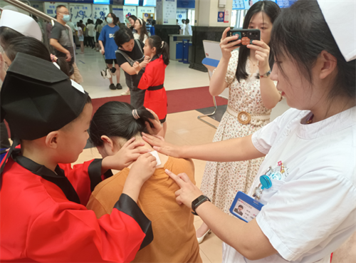 “小中医”在医护人员指导下给妈妈贴三伏贴