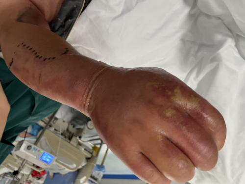 据了解,6月24日,陈力杰的右手手指关节出现了肿胀疼痛,他在家里找到一盒中成药,看到药品说明书上适应病症为“清热解毒、活血化瘀、消肿止痛”,觉得对自己的症状应该有帮助,便把中成药捣碎,外敷于手指关节处,并用纱布绷带包裹。但外敷后情况并没有好转,第二天右手开始出现肿胀、剧烈疼痛、麻木、活动受限,随即蔓延到整个上肢,在当地立博体育