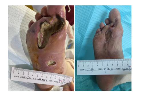 内分泌科马上为刘珍启动了多学科联合诊疗(MDT),经过专家团队联合会诊,为患者制定了规范化、个性化、精准化的综合治疗护理方案。在抗感染、扩血管、降糖、降压、补充白蛋白、伤口换药等专科治疗的基础上,请外周血管介入科进行了下肢动脉造影和下肢动脉腔内成形术,手足显微外科进行了右足部创面清创、抗生素骨水泥覆盖创面术。一个月之后又为老人创面进行了骨水泥取出、创面清创、取皮植皮、人工真皮覆盖、慢性溃疡修复及VAC负压引流术等。