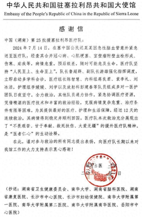 收到一封来自我国驻塞拉利昂大使馆给第25批援塞医疗队发来的感谢信,特别提及立博体育