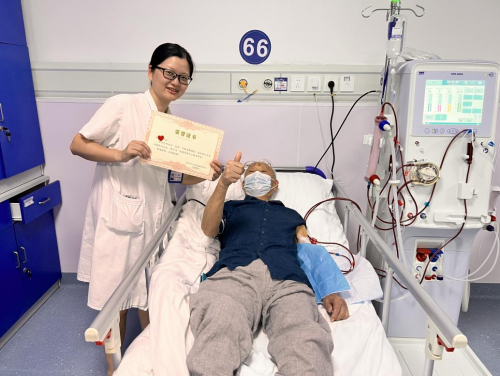 三年前,廖爷爷因为肌酐升高、病情急剧恶化被诊断为慢性肾功能不全、尿毒症等严重疾病,于是在亲人的陪伴下来到该院肾病、风湿免疫科的血液净化中心接受透析治疗。面对高龄与复杂基础疾病的双重挑战,每一次透析治疗对廖爷爷来说都如同攀登险峻高峰。管床医生、副主任医师夏熊芳及血液净化中心团队始终陪伴并支持着廖爷爷,为他制定科学合理的治疗方案,精心护理,廖爷爷的身体状况日益好转。