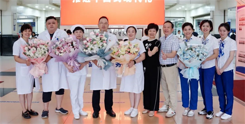 经过紧张而有序的抢救,章女士的生命体征逐渐稳定,随后被送往急诊进行进一步治疗。目前,她已转至神经内科接受后续治疗,情况良好。在病房住院的章女士和爱人刘先生一直想要感谢这群救命恩人,不仅在病房偷偷录下了感谢视频,无意中得知三天后的今天是中国医师节,更是特意购买了5束鲜花送给大家,于是便出现了文章开头的那一幕。