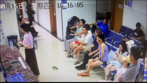 监控清楚地记录着,事发当时章女士坐在候诊区,脸色发白,不停用手捶打胸口,旁边的刘先生手忙脚乱地给她掐人中。就在刘先生有点手足无措的时候,门诊护士张利娟凭借敏锐的职业敏感性和高度的责任心,第一时间察觉到了章女士的异常。面对脉搏微弱、意识模糊的章女士,张利娟迅速作出反应,紧急呼叫医生前来援助。此时,运动医学科主任、副主任医师李良军恰好前往治疗室,他毫不犹豫地立即过来查看章女士病情。