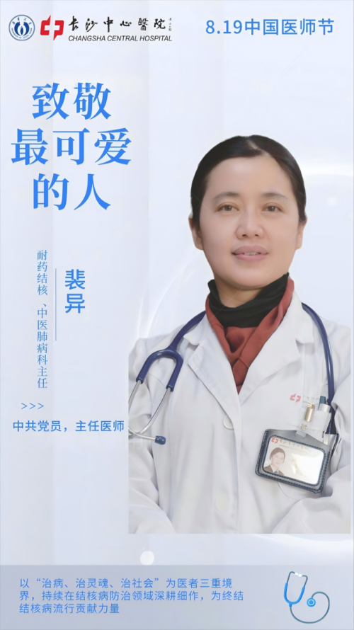 裴异,女,中共党员,主任医师,耐药结核、中医肺病科主任。从医27年来,秉承着“干一行,爱一行”的工作信念,从一名青年医生成长为敢啃耐药结核“硬骨头”的先锋,先后获评人民日报“国之名医·优秀风范”奖、湖南省遏制结核病行动计划先进个人、长沙市优秀医生等荣誉。