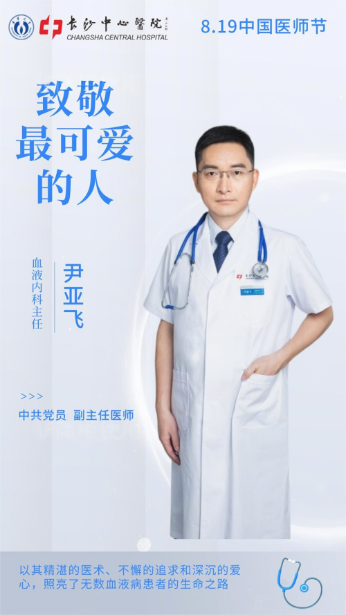 尹亚飞,男,中共党员,副主任医师,内科学(血液病方向)博士,血液内科主任。现任湖南省医师协会血液科医师分会委员、湖南省医学会血液学专委会青委。擅长淋巴瘤、骨髓瘤、白血病等血液系统恶性肿瘤的诊治,在各类非恶性血细胞减少性疾病、出凝血疾病的诊治上积累了丰富经验。