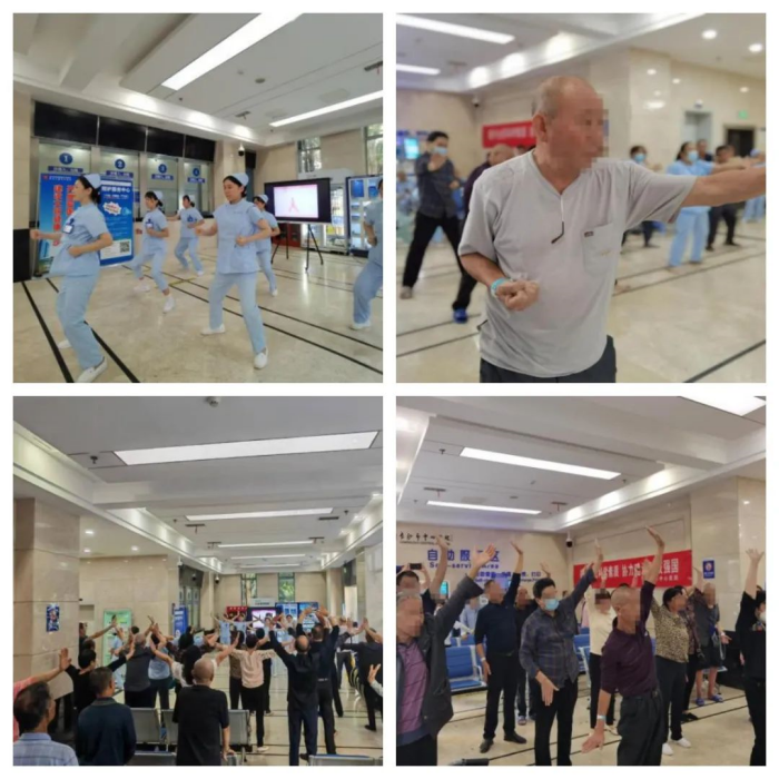 伴随着舒缓的音乐,各科护士长领头开始了“八段锦”的演练。患者认真学习,逐渐从“一呼一吸”中感知身体带来的愉悦。