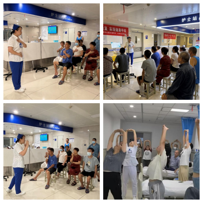 讲座开始,领班护士王瑶从“肺康复是什么”“为什么要做肺康复”“何时与如何进行肺康复”等方面以通俗易懂、幽默风趣的方式为患者进行详细讲解,涵盖了营养、呼吸锻炼、运动锻炼以及心理干预等内容。王瑶积极解答患者、家属提出的相关问题,带领患者与家属进行缩唇呼吸、腹式呼吸、主动呼吸训练技术与IYTW呼吸操练习,帮助咳痰困难的患者有效排痰,促进肺康复。