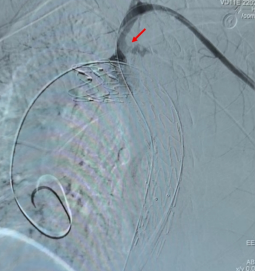 面对如此严峻的情况,赵扬程及介入团队迅速将球囊通过右侧股动脉输送至左侧锁骨下动脉,并根据CT图像经验性封堵破口。在破口封堵以及各种抢救措施的共同作用下,患者终于恢复了自主心率及血压。由于患者左锁骨下动脉破口距离主动脉太近,单纯应用覆膜支架覆盖破口,有手术失败的风险。赵扬程团队决定,再穿刺左侧股动脉,为患者植入胸主动脉覆膜支架以覆盖左锁骨下动脉开口,并穿刺左侧肱动脉进行左锁骨下动脉根部栓塞。经过这一系列复杂精准的操作,患者的生命体征逐渐平稳。