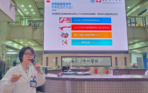 在卒中科普宣教活动中,神经内科主治医师曾俊晟通过专业而通俗的科普讲座,向市民及病友传授了“BE FAST”口诀,帮助他们快速识别早期卒中症状。“B”代表Balance(平衡),即突然失去平衡或协调能力;“E”代表Eyes(眼睛),指突然出现视力模糊或丧失;“F”代表Face(面部),即面部出现不对称或口角歪斜;“A”代表Arms(手臂),指手臂突然无力或下垂;“S”代表Speech(言语),即言语不清或理解困难;“T”代表Time(时间),强调一旦发现上述任何卒中迹象,应立即拨打急救电话并迅速就医。同时,曾俊晟还通过图文并茂的方式,深入阐释了脑卒中发病急骤、病情快速恶化及严重后果等特点,强调了时间对于卒中救治的重要性。
