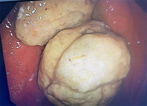 胃镜下可见多个巨大结石