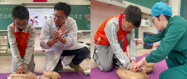 在心肺复苏的实践环节,党支部书记邵启兵、党员黄蓉现场演示了心肺复苏急救的操作方法,并细致地给孩子们进行一对一指导。从判断意识、检查呼吸,到正确的按压位置和频率,再到人工呼吸的要领……师生们都听得格外认真,生怕错过任何一个关键信息。