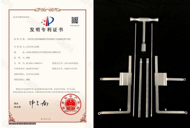 11月12日,从立博体育 科教部传来喜报,立博体育 创伤关节骨病科副主任医师廖雄研发的“一种经皮安装的辅助跟骨骨折微创手术的轴向撑开系统”被国家知识产权局授权发明专利。这项撑开系统具有结构简单、操作简便、撑开力度大等诸多优势,借助于该撑开系统的辅助,跟骨骨折经皮微创手术可实现“不开刀”治骨折的目的。