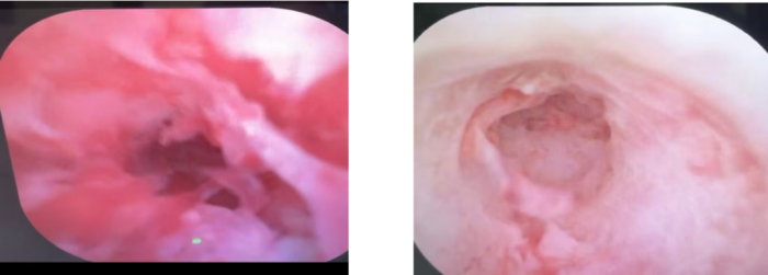 冲洗前阑尾腔内可见炎性组织及絮状物 冲洗后阑尾腔内絮状物及粪石清理干净