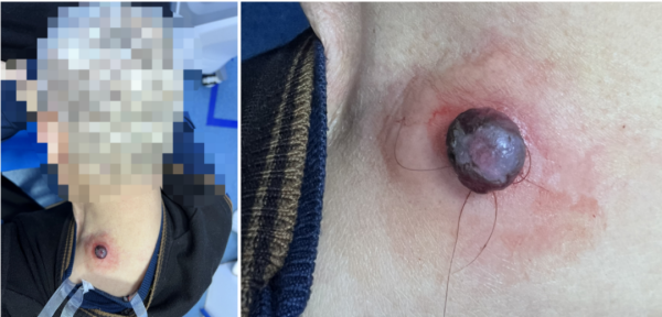 家住雨花区、75岁的老人刘长留(化名)发现自己颈后侧长了一个黄豆大小的“肉疙瘩”,他想起以前听人说过,用头发丝缠住“肉疙瘩”可以使其自行脱落,便动手尝试。没想到,头发丝缠了一周,“肉疙瘩”不但没有脱落,反而异常增生,逐渐变成了一个比黄豆大十倍的深红色橄榄形状物,并伴随剧烈疼痛。