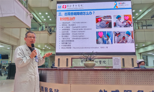 在科普讲座环节,陈立早主任以《关注吞咽健康,畅享美味生活》为主题,深入浅出地向市民介绍了吞咽障碍的早期识别方法、家庭康复训练技巧、饮食调整策略以及预防吞咽障碍的有效措施。他通过生动的案例,讲解了头颈部肿瘤术后患者和脑卒中患者吞咽障碍的康复要点,并指出了喂食过程中的常见误区。