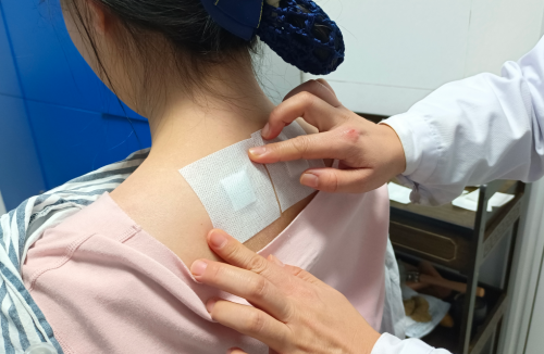“除了‘三九灸’,还可以尝试‘三九贴’的中医特色疗法。”欧降红继续介绍,“三九贴”是一种外用贴膏,直接将调配好的中药碾磨成粉末,熬制成膏药,贴在特定的穴位上。依靠药物的温热作用,渗透皮肤,刺激经络和组织,促进血液循环和气血活动,从而起到疏通经络、消肿止痛的作用。尤其适用于一些表浅的疾病,如骨伤、肌肉扭伤、颈椎病等,也常用于调理儿科疾病、呼吸系统疾病、消化系统疾病等。其操作简单,方便患者在家进行。